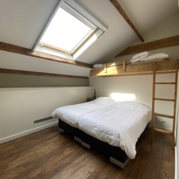Op de bovenverdieping van het vakantiehuis zijn 5 slaapkamers. Elke slaapkamer is voorzien van 2 x 1-persoonsbedden (boxspring) en een stapelbed of hoogslaper. Alle slaapkamers hebben een eigen douche en wastafel. Op verzoek hebben wij een campingbedje ter beschikking en kinderstoelen.